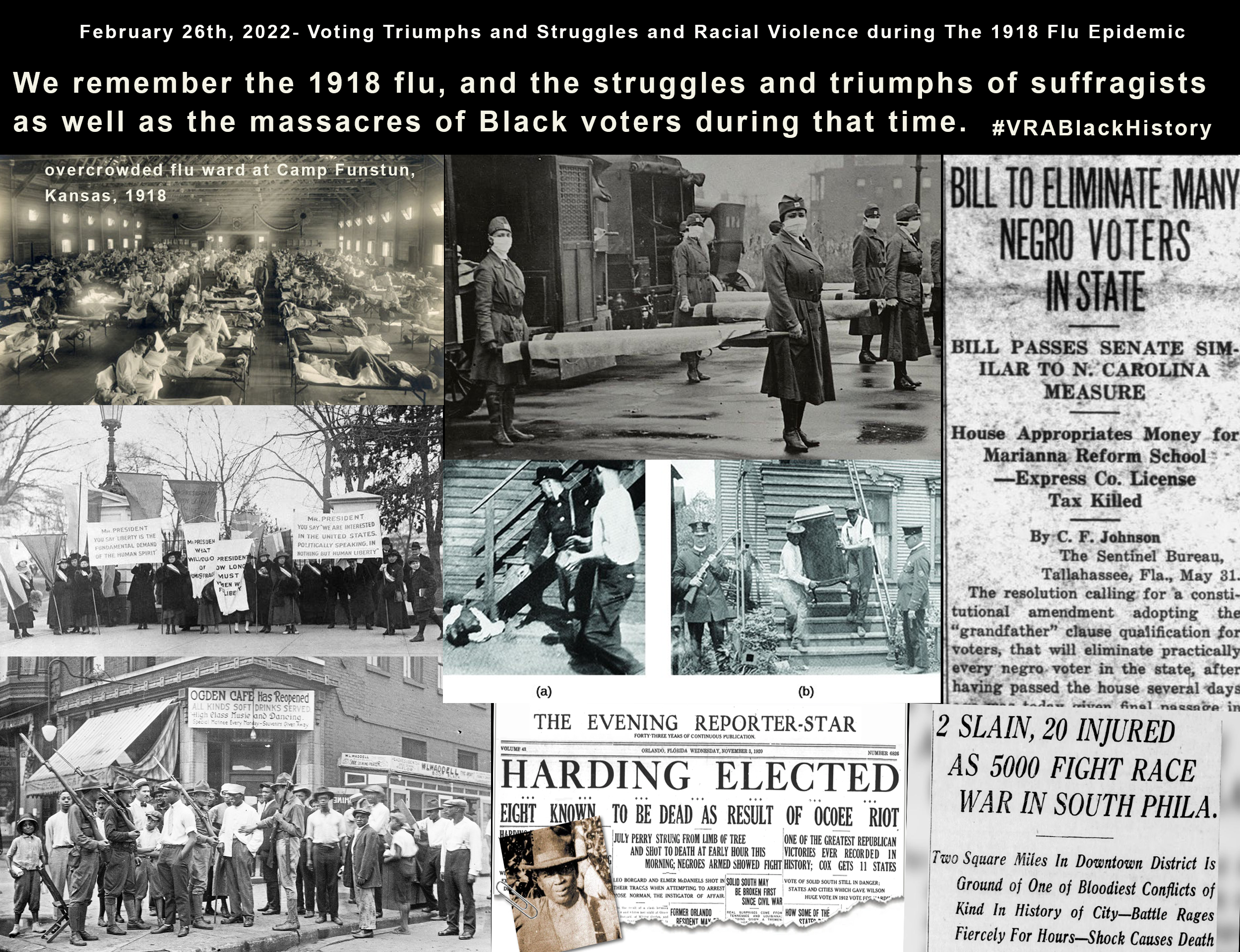 February 26th, 2022, we remember the 1918 flu, and the struggles and triumphs of suffragists as well as the massacres of Black voters during that time.