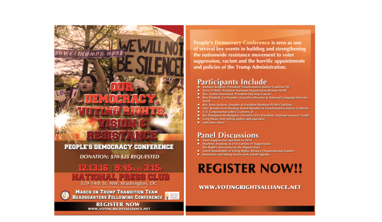 The People's Democracy Conference (PDC) was the Voting Rights Alliance hitting the ground running!Following the 2016 elections, the PDC was our continued effort to not only wage a defensive war for our voting rights again, but to also wage a bold, inclusive, and an offensive campaign. At the time of the PDC, already 5 states were working on new voter suppression legislation. We couldn't wait until Mid-January! Our 2016 Presidential Election turned out to be a BIG MESS with voter suppression of Blacks, Latinos, Asians, and Native American voters; Hateful and Racist appeals; and, the revelations about the Russian interference. The PDC was designed to be an educational event to re-charge our energies and racial justice movement right before the holiday season! In attendance was a diverse audience of students, activists, lawyers, professionals, and non-professionals all committed to ensuring our Democracy is preserved in this time of threat. The conference featured three panels (voter suppression in the states, Cross Check, and voting machines and strategies moving forward) and a Luncheon Roundtable of leaders of the Voting Rights Alliance. After the conference, there was a short march to the Trump Transition Headquarters.